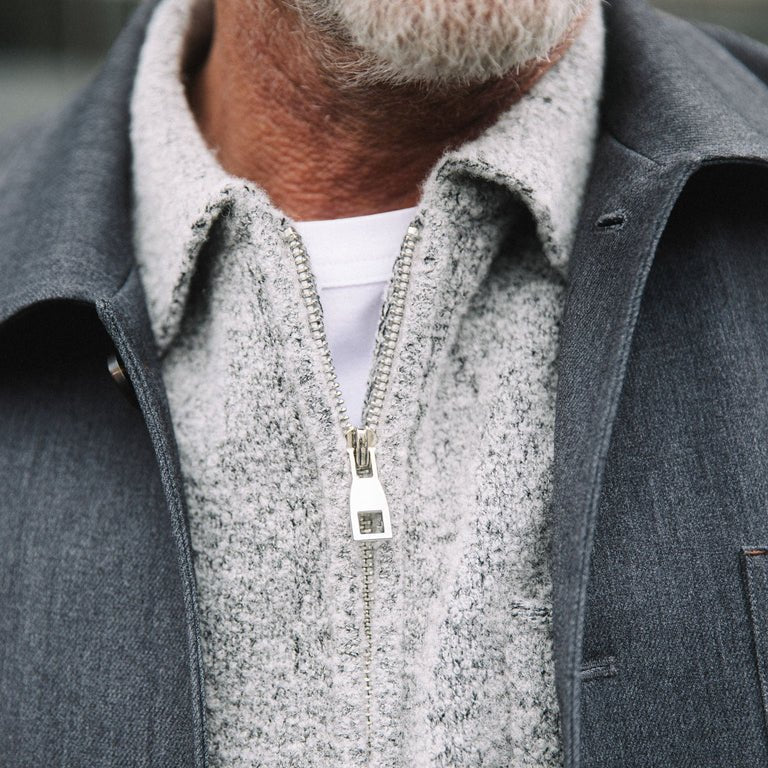 This elevated knit pullover is crafted in soft wool for all-day comfort with a refined feel. The sharp collar, zipper placket, and tonal logo badge at the back give it clean structure with subtle branding. Ideal for denim layering -an effortless blend of utility and polish.